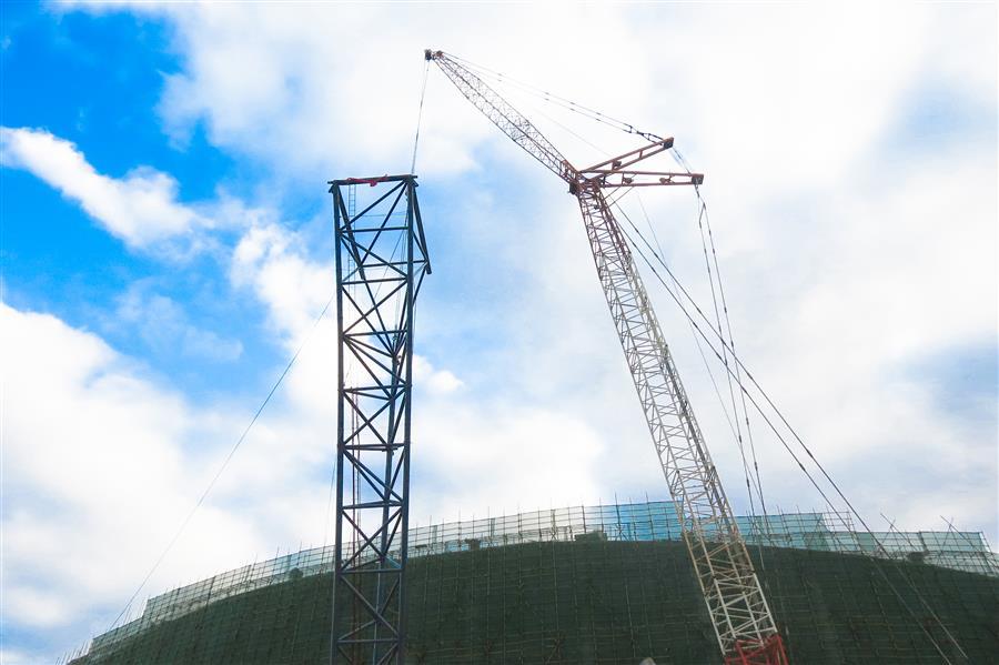 靖西市乒乓主題體育公園鋼結構罩棚空間桁架采用三角桁架形式,桁架柱向外傾斜,與地面夾角呈65°,重量達25噸,桁架柱即徑向桁架為三角管桁架,整體結構呈倒L形,根據(jù)其受力特點可分為懸挑式和前端支承式,懸挑式根部設置撐桿,撐桿連接在看臺勁性柱上。此次桁架吊裝難度大、技術要求高,項目部從構件進場、精準定位、吊裝,每一道工序、每一個環(huán)節(jié)都實行全過程無縫隙標準化管理,全力確保安裝和細節(jié)符合技術要求。