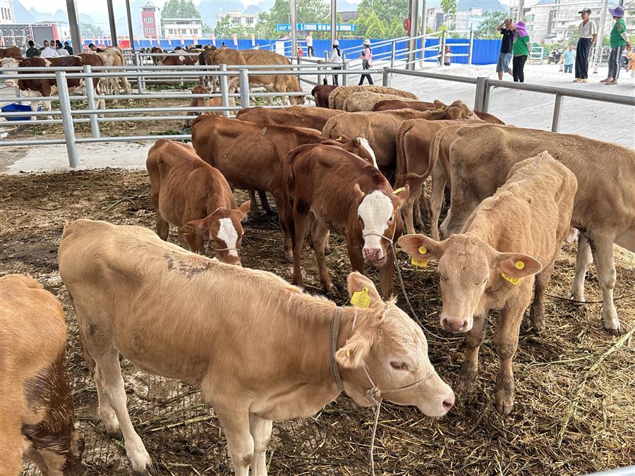 活動(dòng)現(xiàn)場,熱鬧非凡,大家參觀了農(nóng)特項(xiàng)目園區(qū)及桂中牛行,并對園區(qū)今后的發(fā)展提出了意見和建議。桂中牛行作為農(nóng)特項(xiàng)目園區(qū)內(nèi)的首個(gè)主力商家,主營活牛羊交易,副營馬、驢、騾子等草食動(dòng)物交易。試業(yè)當(dāng)天,牛群“哞哞”聲此起彼伏,一頭頭體格健壯的牛兒一字排開,人們?nèi)宄扇旱貒墼谝黄穑屑?xì)挑選著心儀的牛兒。一旁的牛崽交易市場內(nèi),買家更是爭相搶購體態(tài)良好的牛崽,市場交易紅火。