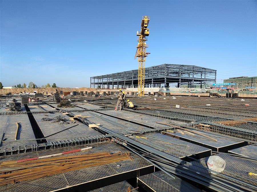 北部生態(tài)新區(qū)智能機(jī)器人標(biāo)準(zhǔn)廠房(二期)--1#、2#、5#、7#標(biāo)準(zhǔn)廠房、13#、14#甲類庫房工程項目,工人在安裝模板。