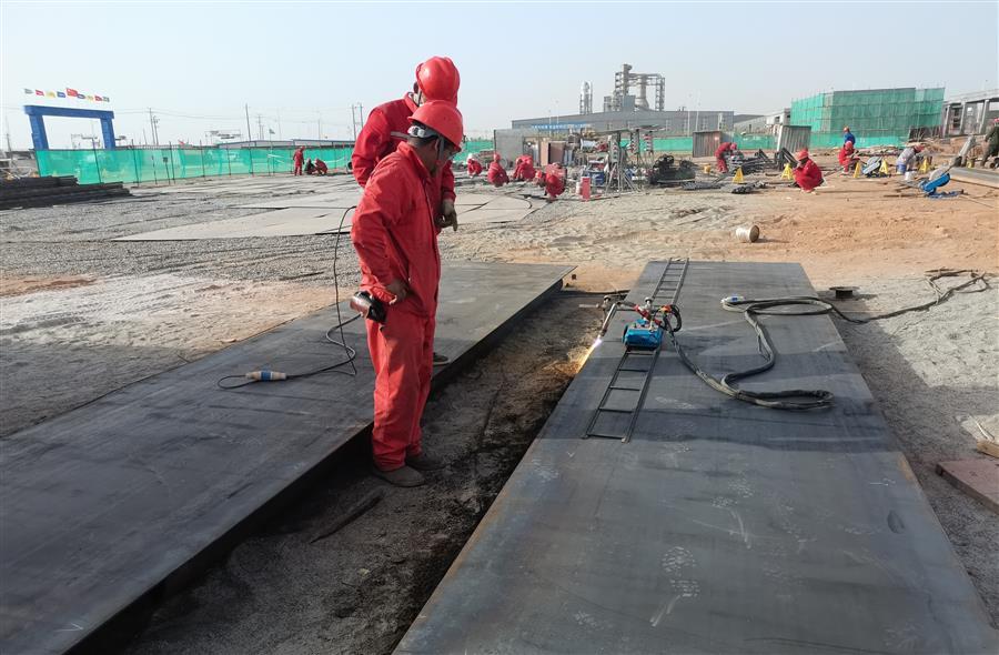 為了保障工程進(jìn)度,在確保安全和質(zhì)量的前提下,建設(shè)者們?nèi)找箠^戰(zhàn)在項(xiàng)目工地,全力加快項(xiàng)目建設(shè)。目前,項(xiàng)目整體進(jìn)度完成55%,廠房配套臨建主體設(shè)施完成65%,1500方儲(chǔ)油罐體焊接已完成10個(gè),完成項(xiàng)目整體罐體焊接55%。剩余工藝管道配套管網(wǎng)正在場(chǎng)外工廠緊鑼密鼓地進(jìn)行生產(chǎn)加工,隨后運(yùn)到廠區(qū)進(jìn)行拼接組裝。