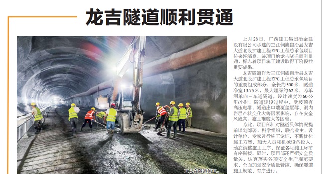 1月2日,《柳州日報》要聞版報道冶建公司桂海分公司承建的三江縣龍吉大道北段擴(kuò)建工程,龍吉隧道順利貫通,項目建設(shè)取得階段性重要成果。
