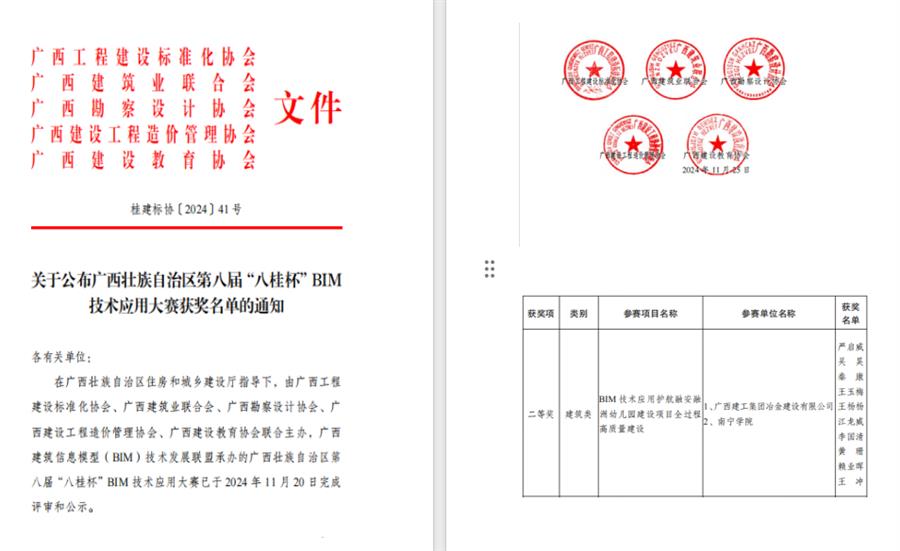 近日,廣西第八屆“八桂杯”BIM技術(shù)應(yīng)用大賽獲獎(jiǎng)名單公布,冶建公司基礎(chǔ)分公司申報(bào)的《BIM 技術(shù)應(yīng)用護(hù)航融安融洲幼兒園建設(shè)項(xiàng)目全過程高質(zhì)量建設(shè)》榮獲施工組建筑類二等獎(jiǎng)。