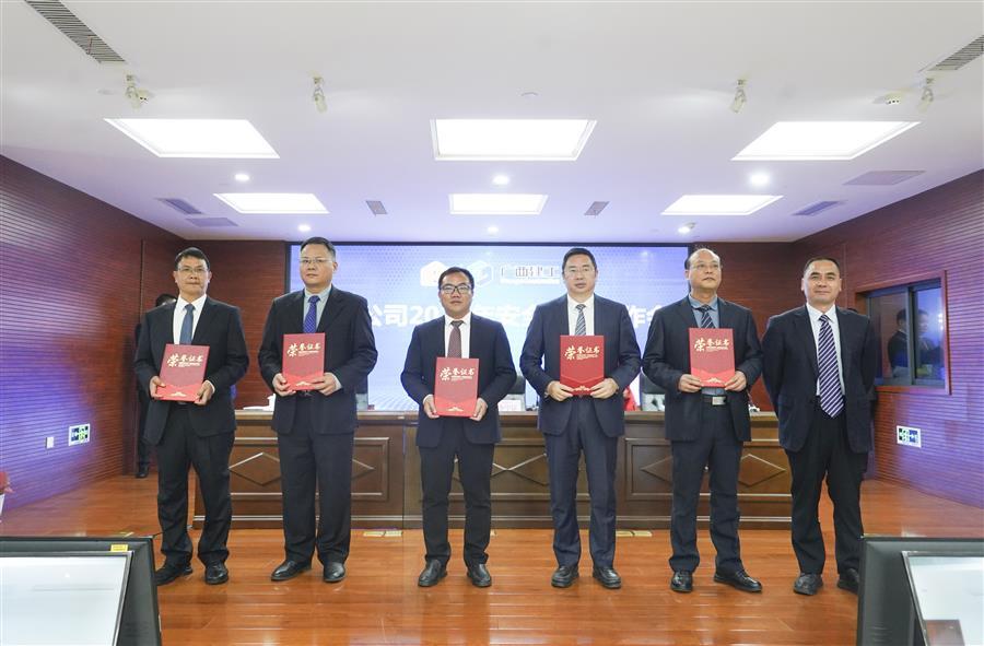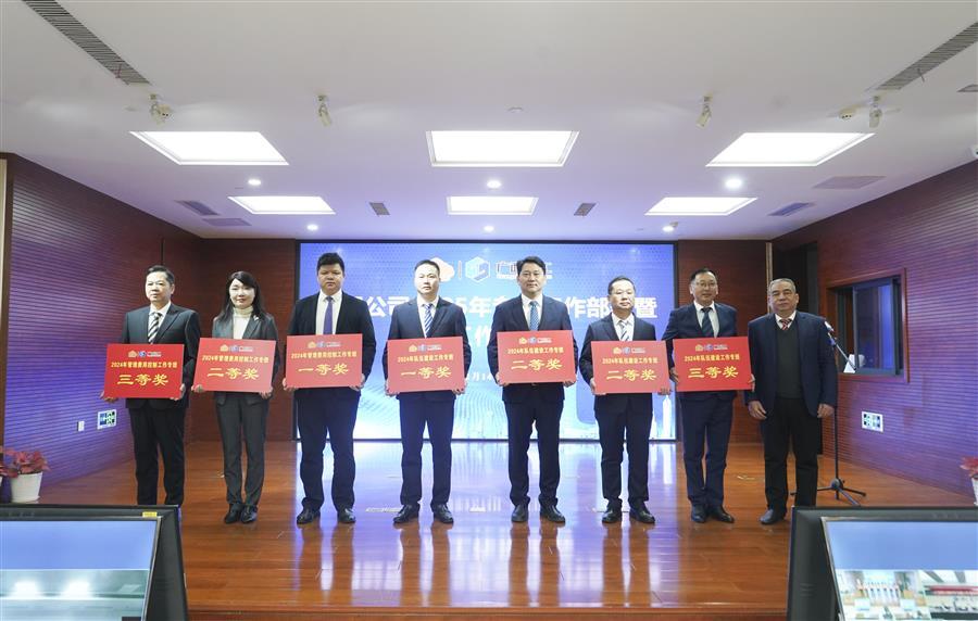 公司董事長(zhǎng)、黨委書(shū)記覃振華(右三)上臺(tái)領(lǐng)取2024年隊(duì)伍建設(shè)工作專(zhuān)班獎(jiǎng),公司總經(jīng)理、黨委副書(shū)記蒙勝益(左一)上臺(tái)領(lǐng)取2024年管理費(fèi)用控制工作專(zhuān)班獎(jiǎng)