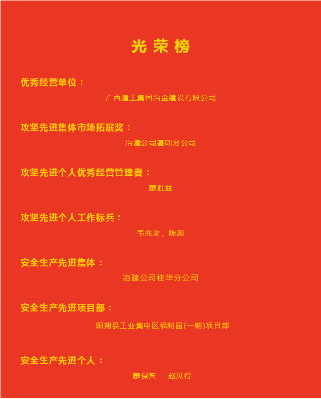 2 月 14 日,廣西建工集團(tuán)有限責(zé)任公司 2025 年專(zhuān)班工作部署暨重點(diǎn)工作推進(jìn)會(huì)、安全生產(chǎn)工作會(huì)、黨建工作會(huì)等系列會(huì)議在南寧召開(kāi)。會(huì)議表彰了2024年度先進(jìn)集體和先進(jìn)個(gè)人,冶建公司榮獲多項(xiàng)集體和個(gè)人榮譽(yù)。