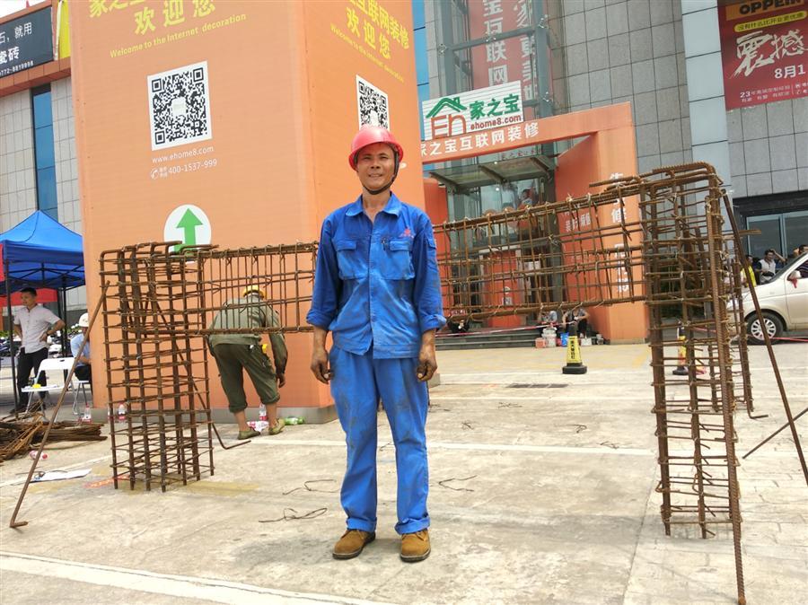 8月31日,在柳州家居建材博覽中心室外廣場(chǎng)上,一群頭戴安全,身著工裝的農(nóng)民工在各自忙碌著,不時(shí)傳來(lái)“叮叮?!变摻钆鲎猜暋ⅰ皣W嘩嘩”刨木聲、“咚咚咚”敲磚聲……伴隨著一片熱鬧的聲響,柳州市第四屆農(nóng)民工技能大賽暨柳州市第三屆農(nóng)民工家庭服務(wù)業(yè)大賽火熱舉行。