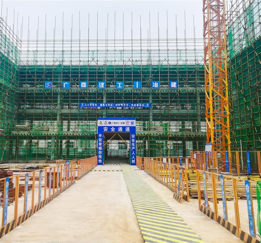 該項(xiàng)目由桂金分公司承建,總建筑面積14993.85平方米,包括1棟9層40.35米高的業(yè)務(wù)綜合樓和1層10.8米高的報(bào)告廳,以及大門、圍墻、供配電、給排水、道路及地面硬化、擋土墻、綠化、醫(yī)療氣體系統(tǒng)等附屬設(shè)施及電梯等設(shè)備購置。目前,項(xiàng)目已完成整體地下室及主樓1~5主體框架結(jié)構(gòu)施工,目前正在進(jìn)行主樓6層內(nèi)架搭設(shè)。