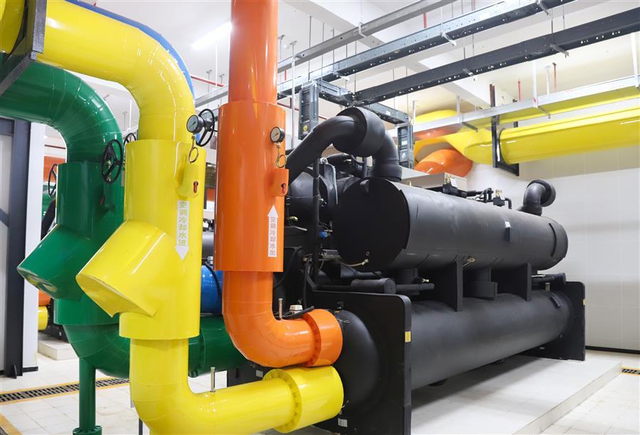空調(diào)機房設(shè)備排布成排成行,空間合理,管線采用落地式共用管架。