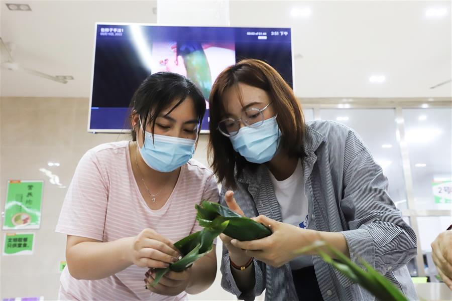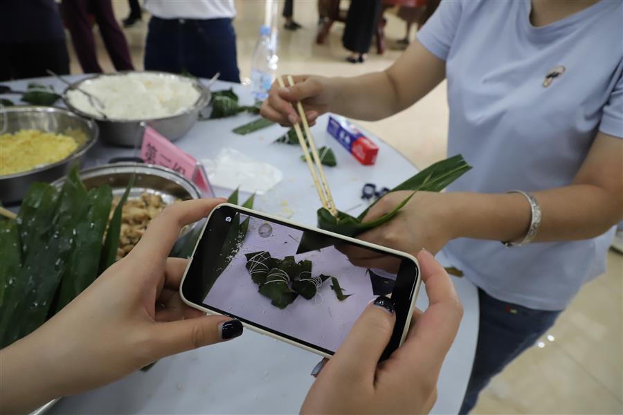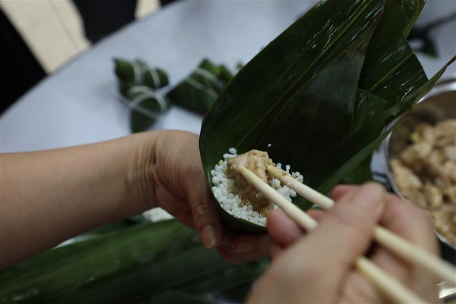 經(jīng)過簡單的現(xiàn)場教學(xué)后,大家領(lǐng)取材料,分組配合,踴躍參與包粽子比賽,只見大家捋粽葉、放餡、封口、扎捆,動作一氣呵成,不一會兒,一只只各式各樣的粽子就在大家手中成型。